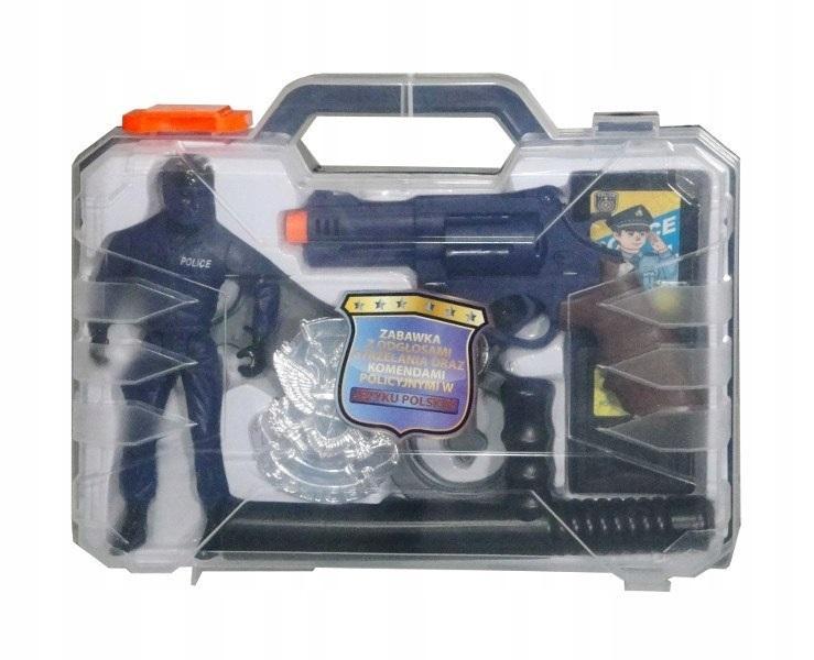 Pistolet z dźwiękami syreny policyjnej, strzelania, przeładowania broni oraz komendami policyjnymi w języku polskim: "Do wszystkich jednostek: Zgłaszam napad, ruszajmy do akcji", "Policja! Ręce do góry", "Stój, bo będę strzelał", "poddaj się, rzuć broń! Jesteś otoczony", "Jesteś aresztowany, jedziemy na komendę". Produkt działa na baterie typu AG10. Baterie znajdują się w zabawce. Zabawka zapakowana w przezroczystą walizkę. Produkt dla dzieci od 3 lat. Podane wymiary stanowią wymiar opakowania.