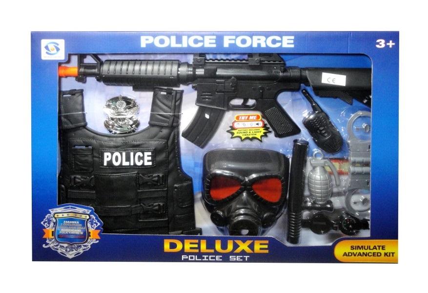 Zabawka z dźwiękami syreny policyjnej, strzelania, przeładowania broni oraz komendami policyjnymi w języku polskim: ""Do wszystkich jednostek: Zgłaszam napad, ruszajmy do akcji"", ""Policja! Ręce do góry"", ""Stój, bo będę strzelał"", ""poddaj się, rzuć broń! Jesteś otoczony"", ""Jesteś aresztowany, jedziemy na komendę"". W zestawie poza karabinem znaleźć można także maskę, granat, krótkofalówkę, kajdanki, kompas, odznakę, pałkę, kamizelkę. Produkt działa na baterie typu AA. Baterie znajdują się w zabawce