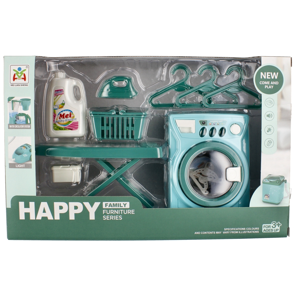 Zawartość zestawu pralka funkcyjna, żelazko, deska do prasowania, kosz na pranie, 5 x wieszaki na pranie, płyn do prania, pojemnik na proszek do prania.