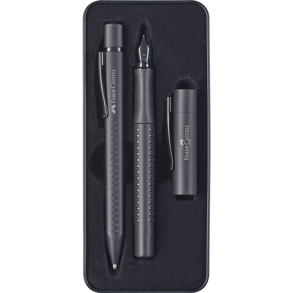 Zestaw prezentowy z limitowanej serii Grip 2011 Faber-Castell z piórem wiecznym i długopisem automatycznym w kolorze all black w metalowym opakowaniu prezentowym. Produkty z tej serii zostały zaprojektowane dla niestrudzonego pisania, przyciągają wyjątkowym designem i modnymi kolorami. To połączenie klasycznej estetyki i użyteczności. Ergonomiczny trójkątny kształt, doskonałe wyważenie i charakterystyczna dla tej serii opatentowana strefa Grip z małymi, antypoślizgowymi punktami zapewniają wysoki komfort i wygodę użytkowania. Pióro wyposażone zostało w wysokiej jakości wytrzymałą stalówkę ze stali nierdzewnej w rozmiarze M (medium - średnia) z idealnym przepływem atramentu dla wyjątkowego komfortu pisania. Solidna, irydowa końcówka stalówki i elastyczny metalowy klips na skuwce. Odpowiednie zarówno dla prawo- jak i leworęcznych. Do standardowych nabojów atramentowych. Długopis z niebieskim, wymiennym wkładem o dużej pojemności i elastycznym klipsem jest odpowiedni do wypełniania dokumentów. Z końcówką piszącą pisząca o szerokości XB.