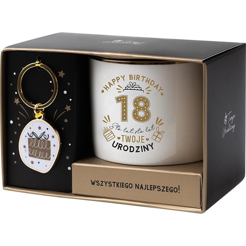 Zestaw prezentowy na 18 urodziny - kubek i brelok z dedykacją. Aby szczególnie uhonorować jubilata, warto odrobinę się postarać i dać mu coś specjalnego z dedykacją. Właśnie tą myślą kierowaliśmy się przy projektowaniu tego zestawu. Zarówno ceramiczny kubek jak i dołączony do zestawu brelok mają specjalną dedykację urodzinową. Kubek wykonano z wysokiej jakości ceramiki, można myć go w zmywarce, a jego pojemność to 330 ml. Metalowy brelok świetnie spisze się jako dodatek do kluczy lub zapinek. SPECYFIKACJA KUBKA: Dedykowany, urodzinowy napis Materiał: Ceramika Pojemność: 330 ml Wysokość: 8,5 cm Szerokość: 8,5 cm Można myć w zmywarce SPECYFIKACJA BRELOKA: Dedykowany, urodzinowy napis Wymiary: 7 cm x 3 cm Materiał: metal Świetny dodatek do kluczy lub portfela ZESTAW W SKRÓCIE: Ceramiczny kubek wysokiej jakości z dedykacją Designerski brelok z dedykacją Prezentowe pudełko