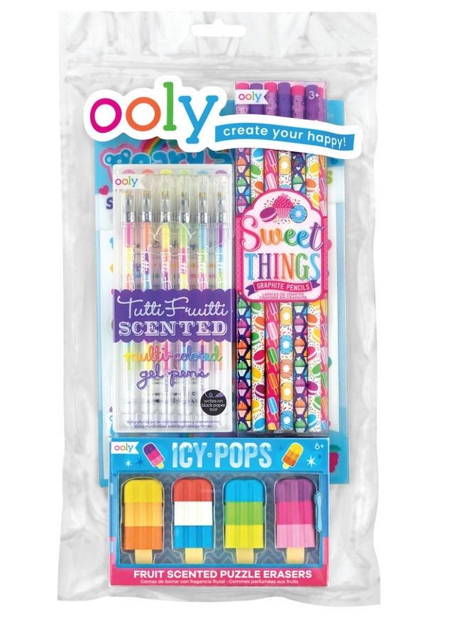OWOCOWE SŁODKOŚCI - Pachnące Naklejki Beary Sweet - Długopisy Żelowe Tutti Fruitti - Ołówki Słodycze - Pachnące Gumki Lody - Rozmiar: 18.5 x 33.5 x 2.5 cm - Opakowanie do zawieszenia