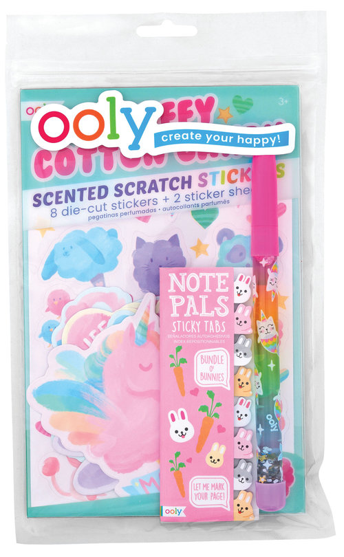 PUSZYŚCI PRZYJACIELE - Pachnące Naklejki Wata Cukrowa - Długopis Tęczowa Brokatowa Różdżka* - Karteczki Króliczki - Rozmiar: 16.5 x 27.5 x 2 cm - Opakowanie do zawieszenia