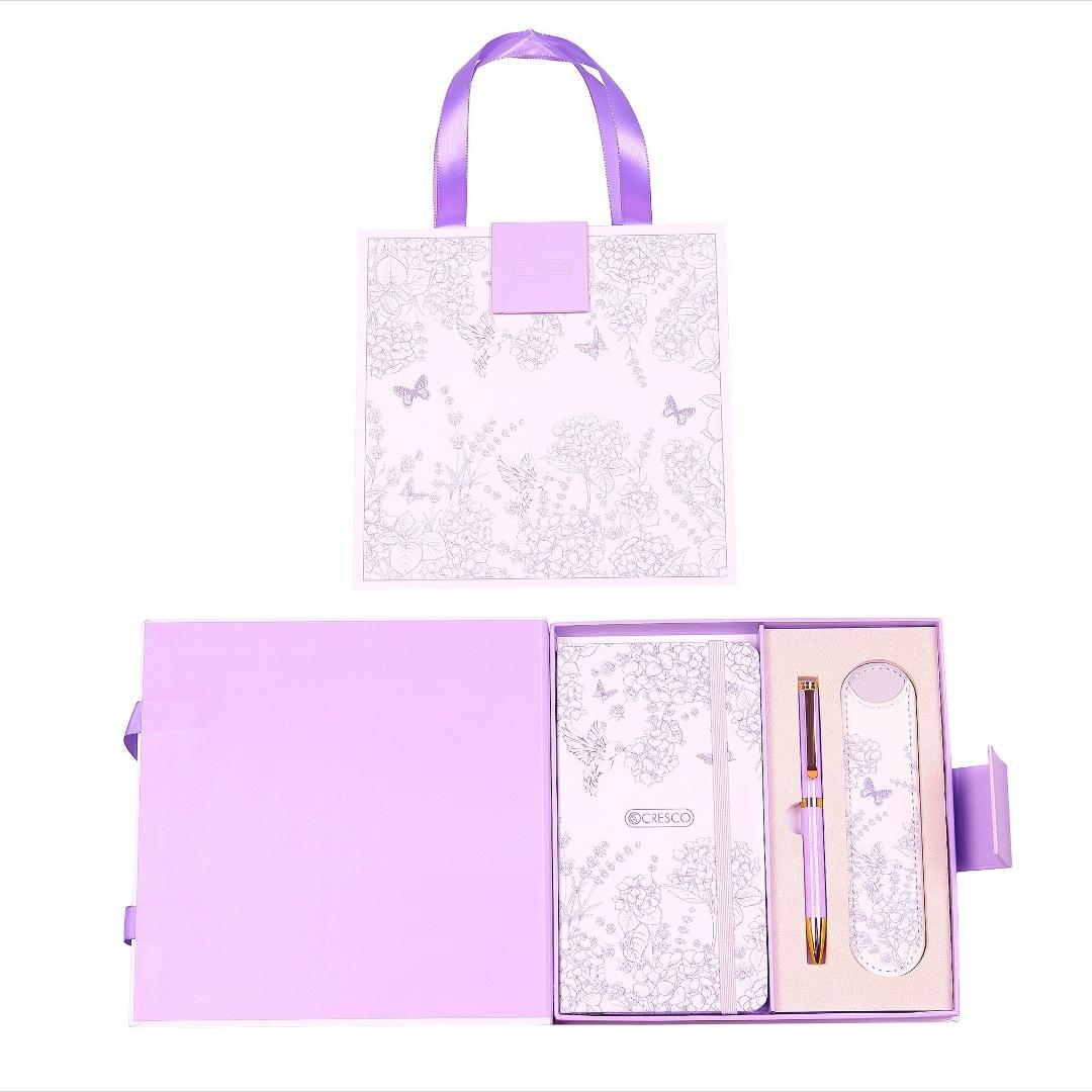 Zestaw prezentowy w ciekawym opakowaniu imitującym torebkę prezentową. Komplet zawiera notes z gumką i wstążką, długopis oraz etui skóropodobne na długopis. Zestaw upominkowy spakowany w kartonowe etui z zapięciem magnetycznym. Po zamknięciu opakowanie przybiera postać torebki prezentowej z uchwytami ze wstążki. Zatem po zakupie jest to gotowy prezent do wręczenia na różne okazje. Kolorystyka fioletowa.