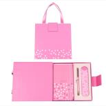 Zestaw prezentowy w ciekawym opakowaniu imitującym torebkę prezentową. Komplet zawiera notes z gumką i wstążką, długopis oraz etui skóropodobne na długopis. Zestaw upominkowy spakowany w kartonowe etui z zapięciem magnetycznym. Po zamknięciu opakowanie przybiera postać torebki prezentowej z uchwytami ze wstążki. Zatem po zakupie jest to gotowy prezent do wręczenia na różne okazje. Kolorystyka różowa.