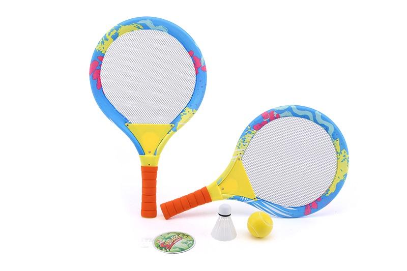 W zestawie: dwie rakietki z miękką siatką śr. 28 cm., lotka 8 cm., piłeczka o śr. 6 cm., pakowane w siatkę, 3+