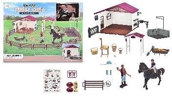 W zestawie: kawiarnia, stanowisko z myjką dla konia, 2 figurki człowieka, figurka konia, 14 x płotek, wiata, akcesoria: koryto, szpadel, stojak na siodło, 2 wiaderka, kosz piknikowy, kask, naklejki, 2 odznaki, szczotka, instrukcja, Funkcje: ściany kawiarni można zamykać i otwierać, ruchome elementy, Pozostałe informacje: wym. kawiarni po złożeniu 16,8 x 22,5 x 22,5 cm, wym. opak. 51 x 38,5 x 8 cm, 3+
