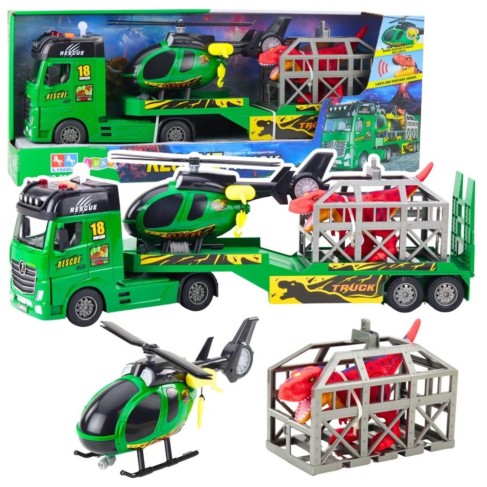 W komplecie znajduje się zielona ciężarówka z naczepą, helikopter ratunkowy z ruchomym hakiem oraz specjalna klatka transportowa z groźnie wyglądającym, czerwonym dinozaurem, który czeka na bezpieczne przetransportowanie. Całość została wykonana z solidnych, bezpiecznych materiałów, a każdy element zachwyca szczegółowością i estetyką wykonania.