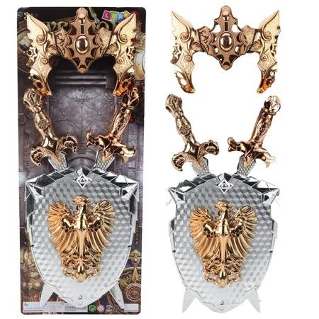 ZESTAW RYCERSKI DLA DZIECI TARCZA Z DWOMA MIECZAMI MASKA Zestaw rycerski dla dzieci to idealna propozycja dla małych fanów przygód, średniowiecznych legend i zabaw w dzielnych wojowników. W zestawie znajdują się dwa imponujące miecze, ozdobna tarcza z motywem złotego orła oraz maska. Zestaw został zaprojektowany z wyjątkową dbałością o detale - bogato zdobione rękojeści, połyskujące powierzchnie, strukturalne wzory i klasyczne motywy sprawiają, że dziecko może przenieść się w wyobraźni do czasów rycerskich pojedynków, turniejów oraz obrony zamków i królestw. To zabawka, która nie tylko cieszy oko, ale również pobudza wyobraźnię i inspiruje do tworzenia własnych, niezwykłych historii. Wszystkie elementy zestawu wykonane zostały z lekkiego, ale solidnego tworzywa sztucznego, które jest bezpieczne w użytkowaniu, odporne na uderzenia i w pełni przystosowane do zabawy przez dzieci. Ich rozmiar został dostosowany do dziecięcych dłoni, co gwarantuje wygodę i komfort użytkowania. Zabawa takim zestawem to doskonały sposób na rozwijanie kreatywności, zdolności manualnych i odgrywanie ról, które wspierają rozwój emocjonalny i społeczny dziecka. To świetna propozycja zarówno do samodzielnej zabawy, jak i wspólnych przygód z rodzeństwem czy rówieśnikami. Zestaw doskonale sprawdzi się jako oryginalny prezent na urodziny, święta lub inne specjalne okazje. SPECYFIKACJA: Wymiary miecza: 41,5 x 9 cm Wymiary tarczy: 25 x 20 cm Wymiary opakowania: 53 x 21 cm Materiał: tworzywo sztuczne Motyw: rycerski / średniowieczny ZAWARTOŚĆ ZESTAWU: 2 miecze z bogatym zdobieniem 1 ozdobna tarcza z orłem Maska Opakowanie typu blister