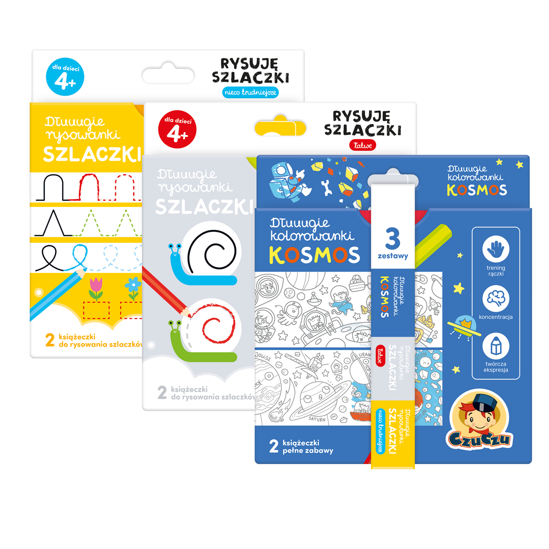 Kreatywny zestaw zawiera 3 tytuły: Dłuuugie rysowanki Szlaczki Łatwe, Dłuuugie rysowanki Szlaczki Nieco trudniejsze oraz Dłuugie kolorowanki  Kosmos.