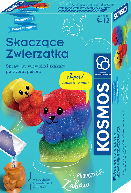 W zestawie znajduje się szpatułka oraz kolorowa instrukcja, która krok po kroku prowadzi przez cały eksperyment, a przy okazji podsuwa ciekawe pomysły na zabawy i zawody ze Skaczącymi Zwierzątkami.