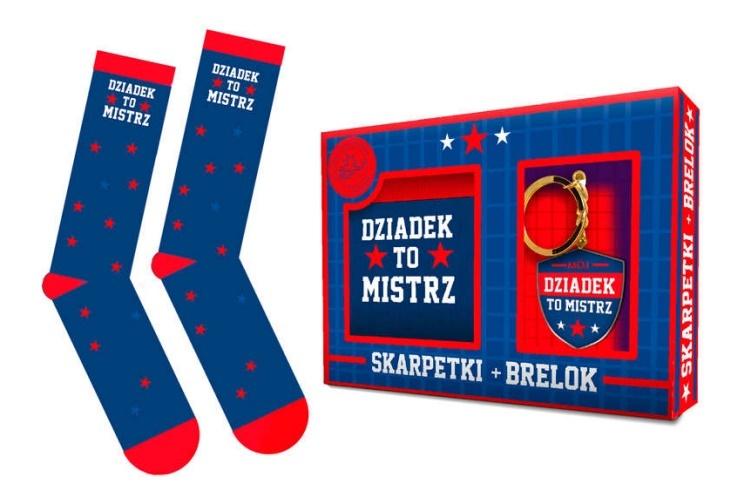 Zestaw prezentowy dla Dziadka: skarpetki i brelok zapakowane w ozdobne pudełko.