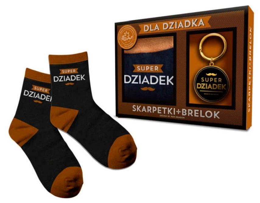 Zestaw prezentowy dla Dziadka: skarpetki i brelok zapakowane w ozdobne pudełko.
