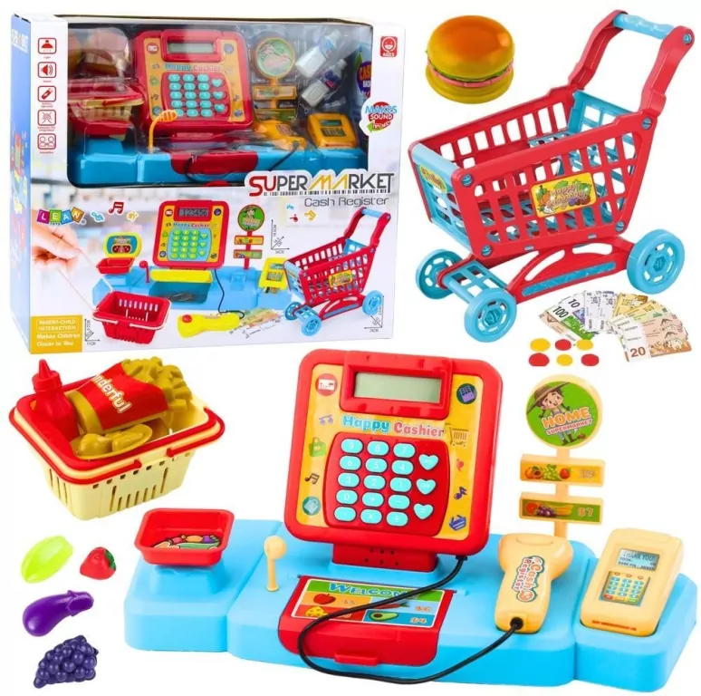 ZESTAW SKLEPOWY - KASA, KOSZYK, PRODUKTY, AKCESORIA Zestaw sklepowy z kasą to kolorowa, edukacyjna zabawka, która pozwala dzieciom odgrywać role sprzedawcy i klienta, ucząc jednocześnie podstaw liczenia, rozpoznawania produktów oraz rozwijając wyobraźnię i kompetencje społeczne. Model został zaprojektowany z myślą o maksymalnej atrakcyjności i funkcjonalności - w zestawie znajduje się kasa fiskalna z kalkulatorem, terminal, koszyk, skaner, telefon, imitacje jedzenia, banknoty, monety i wózek zakupowy. Kasa posiada efekty świetlne i dźwiękowe, a także ruchome elementy, które uatrakcyjniają zabawę - można skanować produkty, otwierać szufladę, korzystać z mikrofonu i wciskać klawisze. Terminal i kalkulator są interaktywne, a dołączony koszyk i wózek umożliwiają zabawę w kompletowanie zakupów. To idealny zestaw do wspólnej zabawy z rodzeństwem czy rówieśnikami - rozwija zdolności manualne, logiczne myślenie, kreatywność oraz umiejętność współpracy. Doskonała propozycja dla dzieci ciekawych świata i zainteresowanych zabawą w sklep. SPECYFIKACJA: Wymiary kasy: 34 x 14,5 x 14,5 cm Wymiary wózka: 24 x 23 x 12,5 cm Wymiary opakowania: 38 x 33 x 15,5 cm Zasilanie: 2x AA 1.5V (brak w zestawie) Efekty: Dźwiękowe i świetlne Materiał: Tworzywo sztuczne ZAWARTOŚĆ ZESTAWU: Kasa fiskalna z kalkulatorem Terminal płatniczy Telefon Skaner Wózek sklepowy Koszyk na zakupy Produkty spożywcze (imitacje) Banknoty i monety Instrukcja