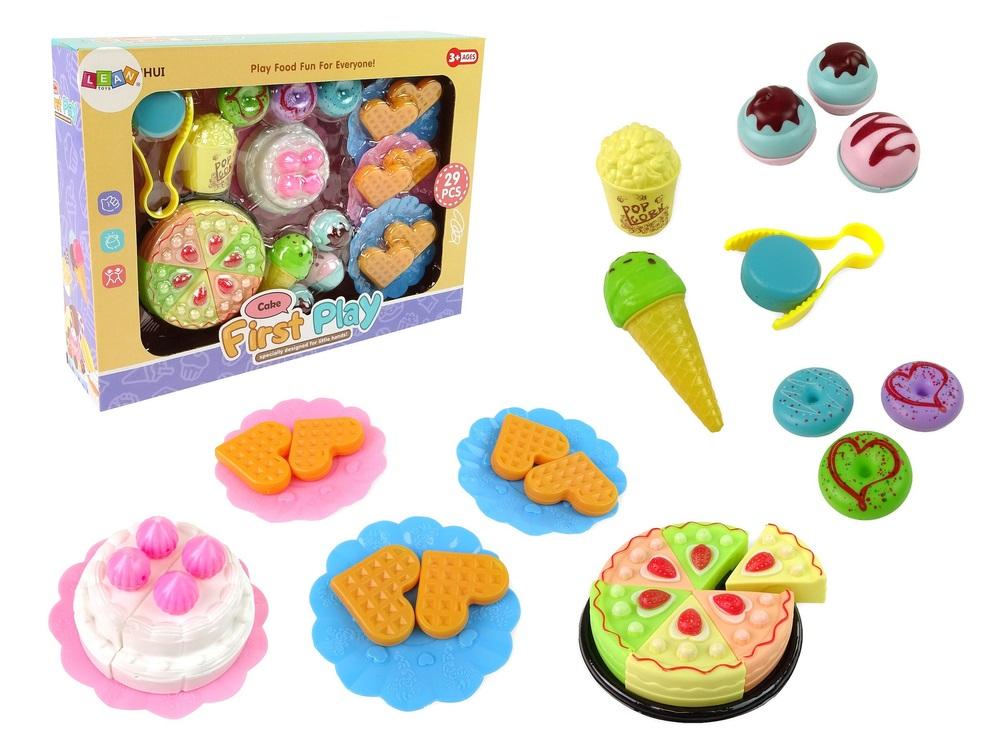 Zestaw Słodkości Ciasto Gofry Kawiarnia 29 Elementów Dzieci uwielbiają słodycze, uwielbiają także imprezy urodzinowe. Na pierwszą myśl przychodzi oczywiście tort! Dzięki zestawowi do zabawy Twoje dziecko będzie w stanie urządzać urocze przyjęcia każdego dnia albo założyć swoją własną małą kawiarnię! Przepiękne gofry w kształcie serduszek, kolorowe ciasto, lody to ulubione przekąski dzieciaków. Za pomocą dołączonych szczypc można nakładać uczestnikom przyjęcia po jednym z wypieku. W całym zestawie znajduje się 29 elementów. Dodatkowe akcesoria jak talerzyki utrzymane są w kolorystyce różowej i niebieskiej. Różnorodne przekąski pozwolą na stworzenie własnej kawiarni, szeroki wybór także ugości nawet najbardziej wybrednych gości. Czas rozpocząć małe przyjęcie! W skład zestawu wchodzą: - Tort - Ciasto - Szczypce do nakładania ciasta, - Rożek - popcorn - 3 donuty - 4 talerze - 6 gofrów w kształcie serca - 3 babeczki Średnica talerzyka: 9 cm Średnica tortu: 7 cm Wymiary opakowania: 33 cm x 25 cm x 8 cm Zestaw słodkości przeznaczona jest dla dzieci powyżej 3. roku życia. Zabawka posiada certyfikat CE i jest zgodna z normą EN 71, całkowicie bezpieczna dla dziecka. Zapakowana jest w kartonik, dzięki czemu nadaje się idealnie na prezent dla dziecka.