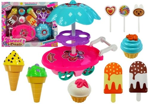 Zestaw Słodkości Wózek Stoisko Lodziarnia Wśród kilkuletnich dzieci odgrywanie ról jest jedną z najciekawszych form rozrywki. Zabawa w sklep jest dobrze znana każdemu pokoleniu, do której dawniej wystarczało kilka zabawek, a zamiast pieniędzy używano liści lub kamyczków. Dzięki miniaturowemu Wózkowi Słodkości Twoje dziecko może wzbogacić swoją doświadczenia o nowe, ciekawe gadżety, za pomocą których będzie w stanie zmienić się w prawdziwego cukiernika! Zestaw Słodkości Małego Cukiernika to utrzymany w uroczych, dziewczęcych kolorach wózek do sprzedaży zabawkowych słodkości. Jego najbardziej charakterystycznymi elementami jest różowy blat ozdobiony naklejkami symbolizującymi słodkie przysmaki oraz jasnoniebieski parasol, również przyozdobiony nadrukami w kształcie słodyczy. Na drążek parasola nakłada się uchwyt, w którym umieścić można sprzedawane zabawkowe lody i muffinki. Do zestawu dołączone są również zabawkowe lizaki, które można umieszczać w przeznaczonych do tego otworkach w blacie. Zawartość Zestawu Słodkości: - Różowy wózek z niebieskim parasolem, - Fioletowy uchwycik na słodkości, - 2 zabawkowe lody w rożku, - 2 zabawkowe lody na patyku, - 2 zabawkowe babeczki, - 3 plastikowe lizaki. Wymiary zabawki: 20 cm x 19 cm x 12 cm Średnica parasola: 12 cm Wymiary opakowania: 39,5 cm x 31,5 cm x 6 cm Zestaw Słodkości sprzedawany jest w jasnym, kolorowym pudełku z dużym, przezroczystym blistrem, dzięki czemu można z łatwością zobaczyć jego zawartość. Ze względu na niewielkie elementy, zestaw przeznaczony jest dla dzieci powyżej 3 roku życia. Zestaw odznacza się certyfikatem CE oraz wyprodukowaniem zgodnie z obowiązującą normą EN 71.