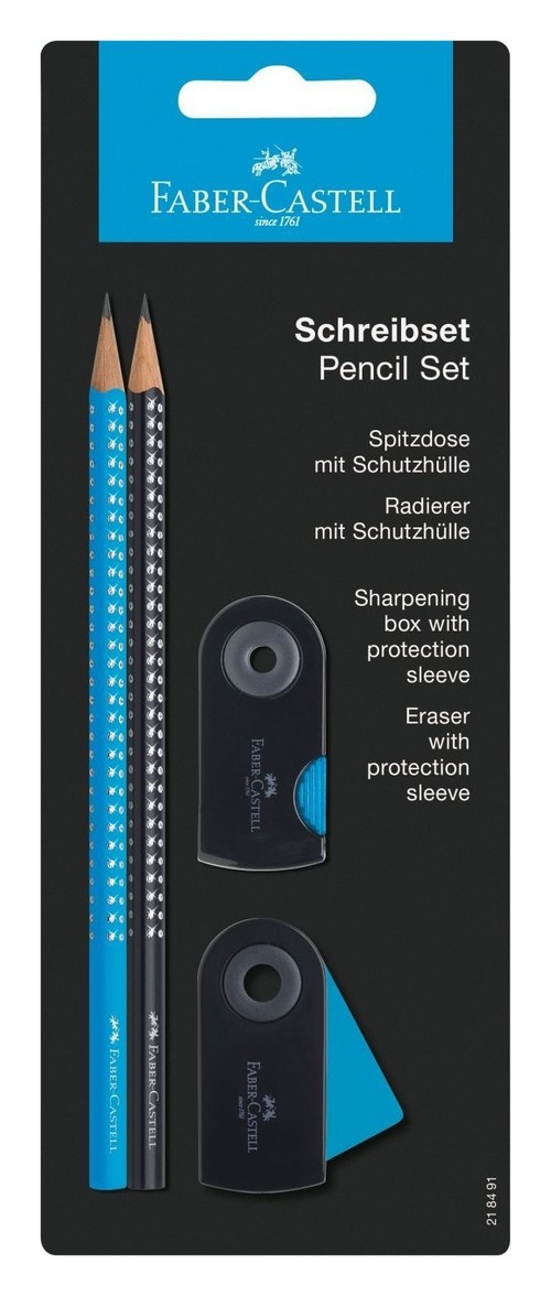 Zestaw dwóch ołówków Sparkle na kartcie blistrowej z temperówką i gumką do ścierania Sleeve. Ołówek B, powierzchnia pokryta błyszczącymi punktami.