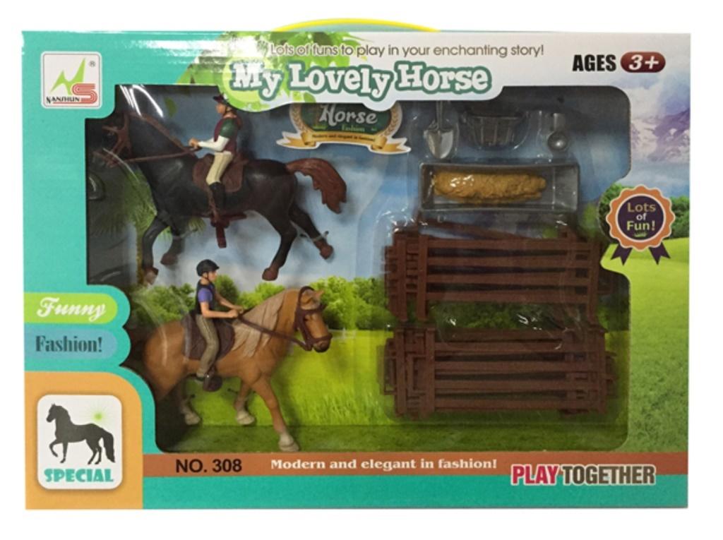 W zestawie: 2 konie 2 figurki jeźdźców płotki akcesoria stajni Wiek 3+