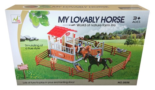Duży zestaw do zabawy z figurkami. Zawiera stajnię, ogrodzenie i dwa konie z jeźdźcami. Dla dzieci w wieku od 3 lat