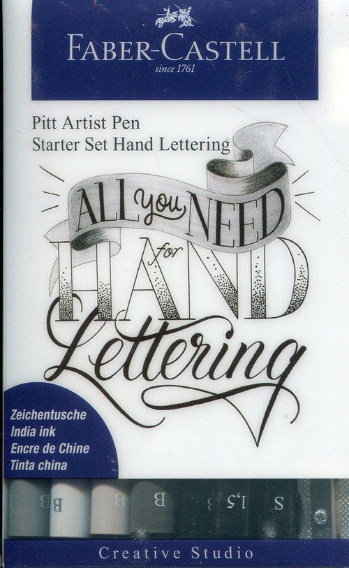 Zestaw pisaków artystycznych Faber-Castell Pitt Artist Pen 7 szt. (5 x z końcówką B pędzelkową w kolorach 199, 274, 272, 233 i 230, S 0,3 mm w kolorze 199, 1,5 mm w kolorze 199) do hand letteringu z akcesoriami (1 x ołówek Castell 9000 B i 1 x temperówka). Pisaki te to połączenie zalet tradycyjnych rysunków wykonywanych tuszem z nowoczesnym, łatwym w użyciu narzędziem. Tusz nadaje rysunkom wyrazistości i trwałości, dając jednocześnie możliwość połączenia z wieloma innymi technikami. Pisaki opracowane zostały z profesjonalnymi artystami zajmującymi się liternictwem i kaligrafią. Idealne do kreatywnego tworzenia liter. Doskonałe również do szkicowania, rysowania i malowania. Zawierają pigmentowany tusz indyjski o neutralnym PH, bez zawartości kwasów. Są bezzapachowe i odporne na działanie światła. Po wyschnięciu wodoodporne, nierozmazujące się na papierze i nie przebijają na drugą stronę. Uwaga - ze względu na tusz pigmentowy pisaki powinny być przechowywane w pozycji poziomej.