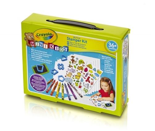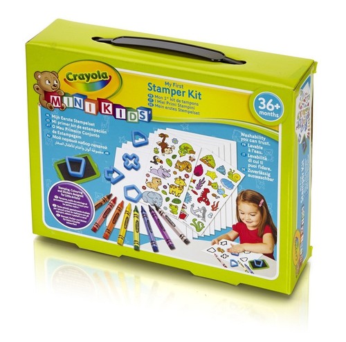 Stempelki Crayola Mini Kids Zawartość: 5 stempelków, poduszka z tuszem, trójkątne kredki, 2 arkusze naklejek, 10 czystych arkuszy papieru. Dla dzieci w wieku od 3 lat.