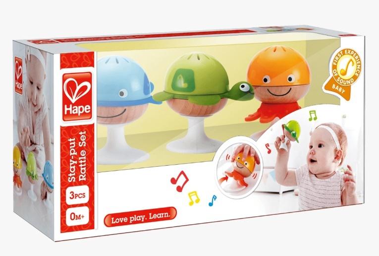 Zestaw stojących grzechotek marki Hape jest zabawką wykonaną z jasnego, naturalnego drewna oraz bezpiecznego, atestowanego tworzywa. Grzechotki wydają ciekawe różne dzwięki, kóre zaciekawią malucha i zachęcą do zabawki. Każda figurka posiada przyssawkę, która umożliwoa montaż na dowolnej, płaskiej powierzchni.
