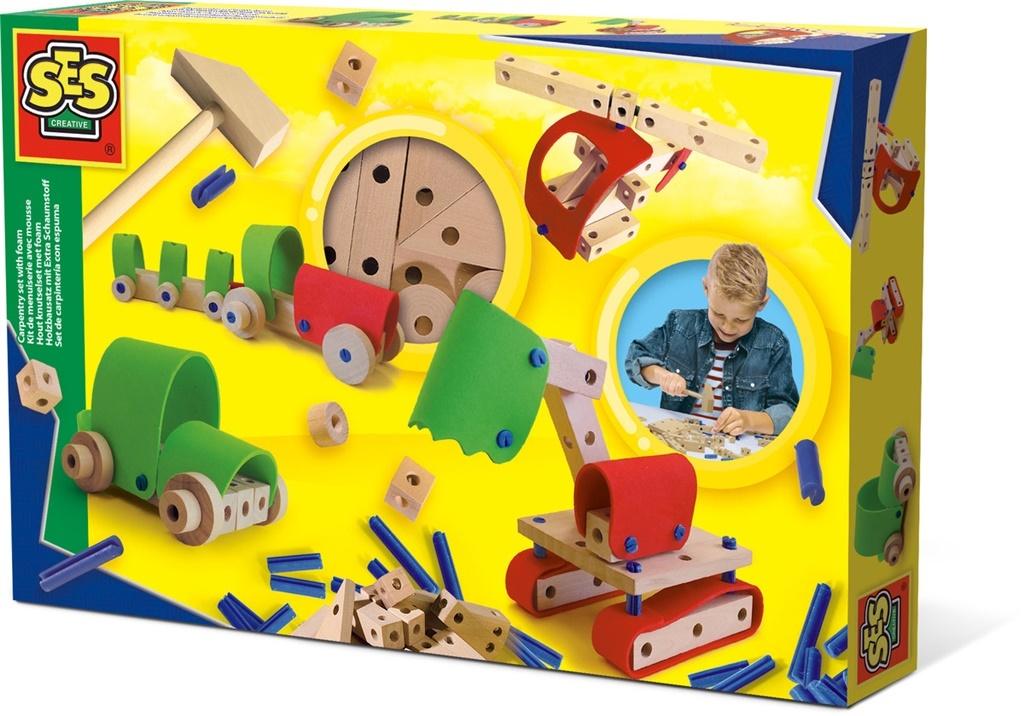 Buduj fajne pojazdy dzięki temu zestawowi konstrukcyjnemu z częściami drewnianymi i piankowymi. Użyj drewniany młotek i plastikowe kołki, aby połączyć ze sobą różne części. Ponieważ części są łatwe do demontażu, masz nieskończoną przyjemność z tym zestawem narzędzi. Wybierz samochód, ciągnik, śmigłowiec lub koparkę albo zrób wszystko!