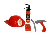Zestaw strażacki dla małego strażaka. Z takim zestawem można przystąpić do zabawy. Zabawka zawiera m.in.: kask, toporek, gaśnicę, krótkofalówkę, odznakę#&Całość zapakowana jest w worek z siateczki.#&Podane wymiary są wymiarami produktu w opakowaniu