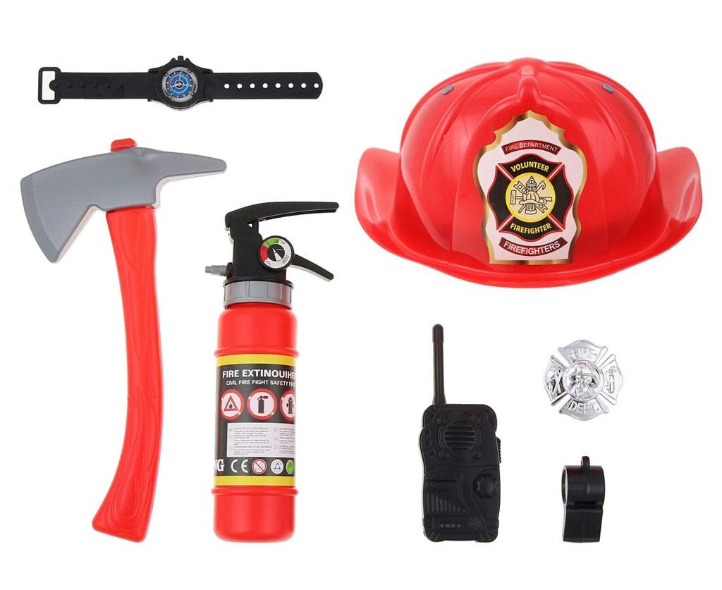 ZESTAW STRAŻAKA (7 ELEMENTÓW) W skład zestawu wchodzą: imitacja zegarka, gaśnica, toporek strażacki, hełm, atrapa krótkofalówki, gwizdek oraz odznaka strażacka Długość hełmu: 27,5 cm Szerokość hełmu: 22,5 cm Obwód głowy: ok. 53 cm (regulowany) Materiał: plastik