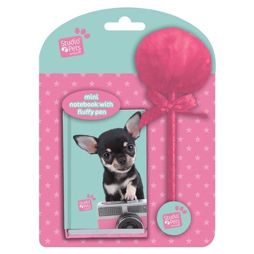 Zestaw Studio Pets chihuahua. Notesik w twardej oprawie o wymiarach 7,5x11 cm, papier 70 g. Posiada 80 kartek z zadrukiem wewnętrznym oraz długopis z pomponem. Pakowany jest na blistrze.