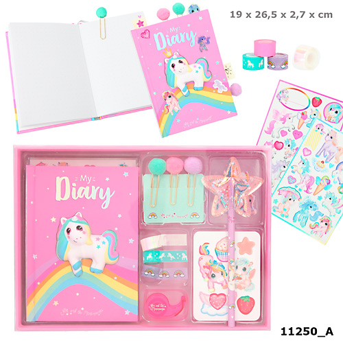 Zestaw Stwórz swój pamiętnik Jednorożec, w zestawie notatnik w linie z wypukłą figurką jednorożca na okładce, ołówek z gwiazdką, 3 klipsy z pomponami, naklejki, 4 taśmy ozdobne i dyspenser do taśm.
