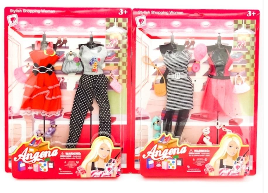 Zestaw sukienek i ubrań dla lalek wraz z akcesoriami. Cena za pojedynczą sztukę, dwa wzory, towar wysyłany losowo.