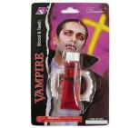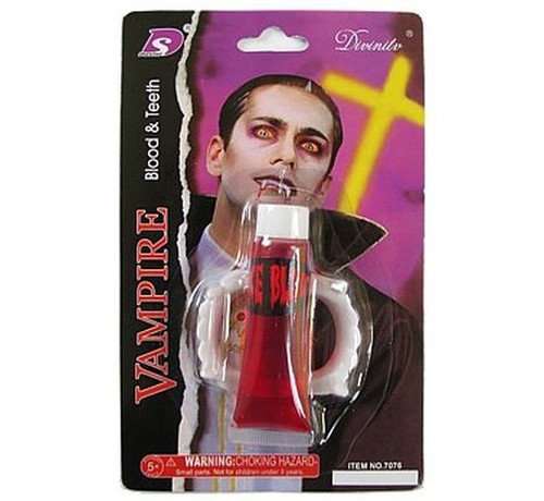Zęby wampira (nakładane na prawdziwe zębyoraz tubka sztucznej krwi 40ml.Krew można spożywać. Ma przyjemny słodki smak.Produkowana na bazie skrobi.
