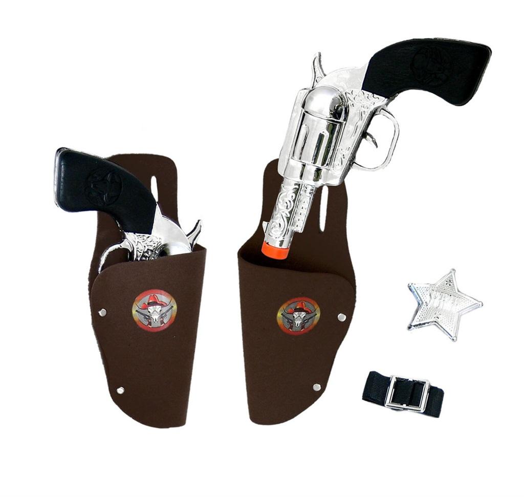 Komplet zawiera 2 kabury, 2 rewolwery, odznakę oraz pasek