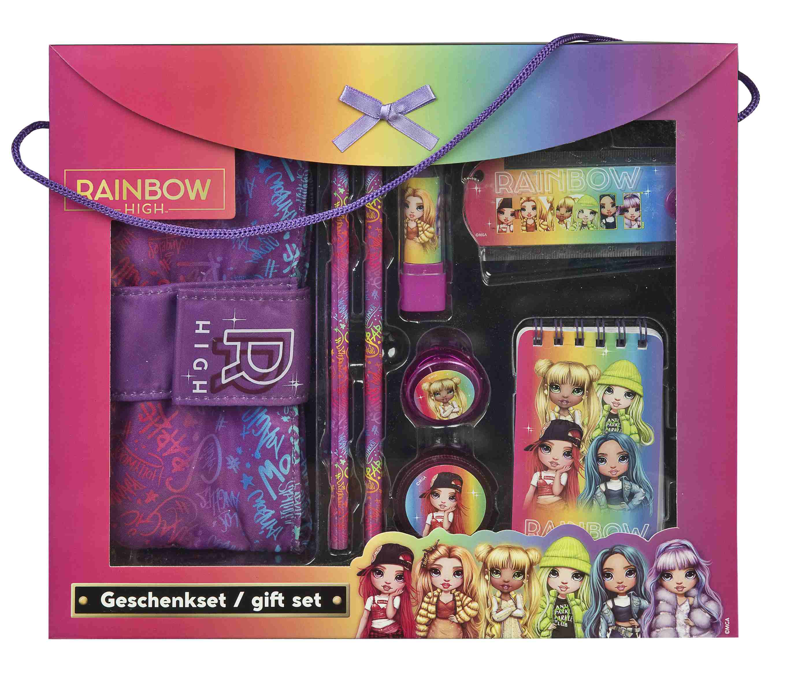 Zestaw kreatywny szkolny RAINBOW HIGH Zawartość: notes, 2 ołówki, gumkę do ścierania w kształci pomadki, klips do papieru, temperówkę, składaną linijkę z lusterkiem, piórnik