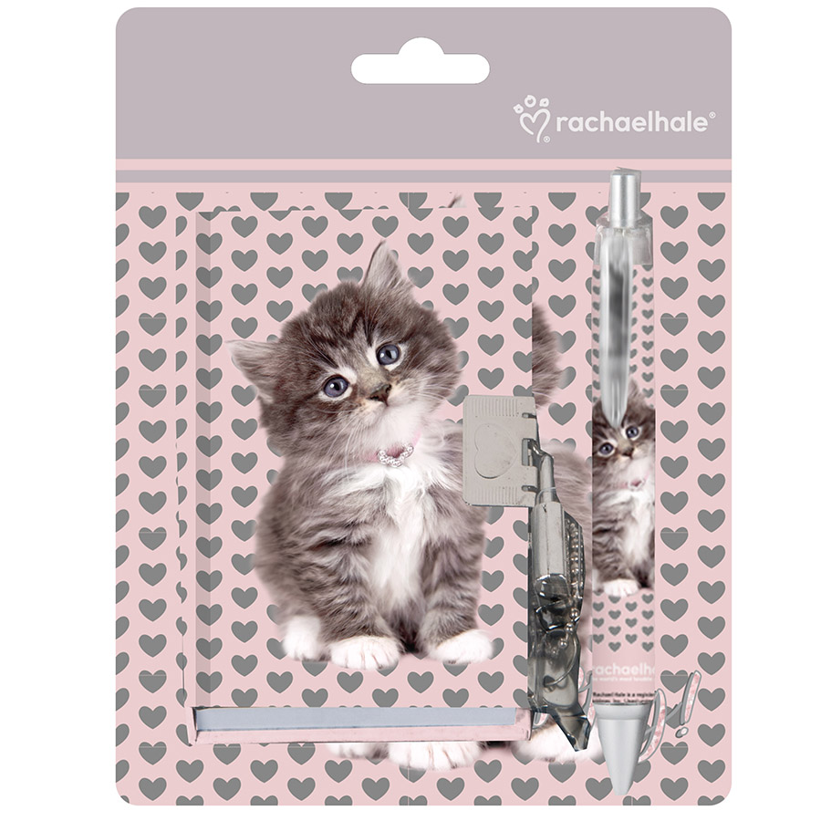 Zestaw szkolny Rachael Hale pudrowy róż w szare serduszka. Notes w twardej oprawie zamykany na kłódkę o wymiarach 10,5x7 cm, 100 kartek w linie oraz długopis automatyczny z niebieskim wkładem.