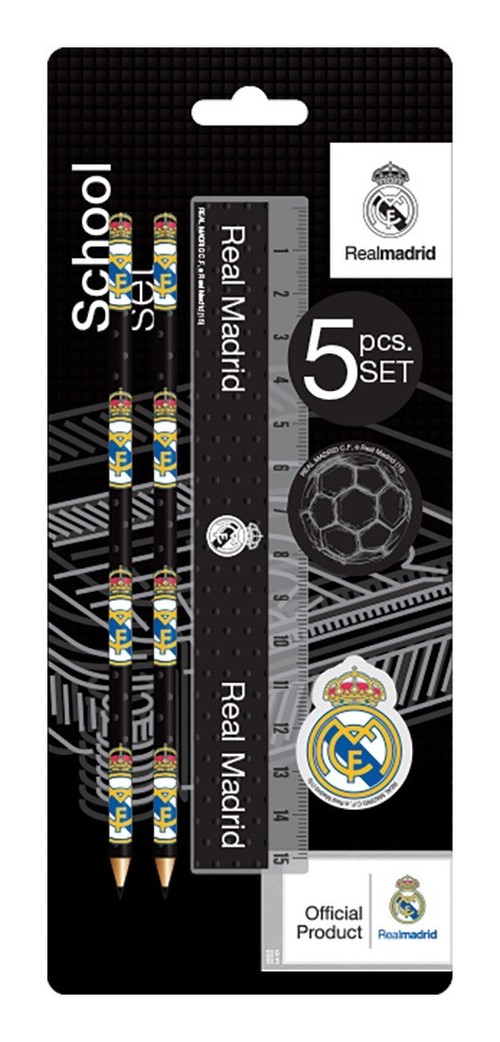 Zestaw szkolny z logo Real Madrid: - 2 ołówki - gumka - temperówka - linijka