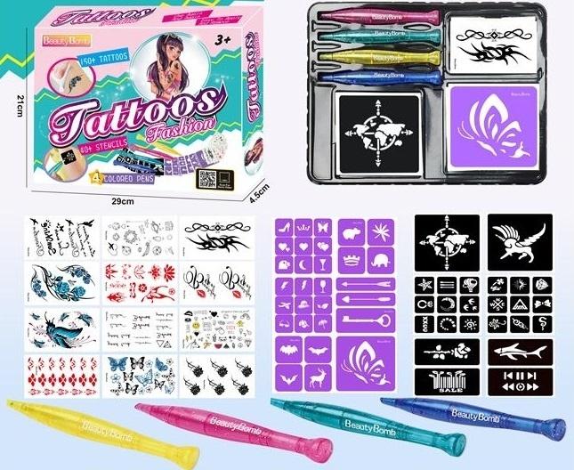 Zestaw Tattoos Fashion od Beauty Bomb to prawdziwe domowe studio tatuażu, które otwiera przed dziećmi świat nieograniczonej wyobraźni i autorskiego stylu. Dzięki imponującej zawartości, obejmującej aż 150 różnorodnych motywów oraz 60 precyzyjnych szablonów, każdy młody projektant znajdzie wzór idealnie oddający jego charakter. Proces tworzenia jest niezwykle prosty i intuicyjny: wystarczy wybrać ulubiony motyw, przyłożyć szablon do skóry i wypełnić go kolorami za pomocą dołączonych, lśniących pisaków. Specjalna formuła tuszu zapewnia efektowne wykończenie, które pięknie prezentuje się na skórze i dodaje blasku każdej stylizacji. To doskonały wybór na przyjęcia urodzinowe, festyny czy kreatywne popołudnia, budujący pewność siebie oraz rozwijający zdolności manualne. Wszystkie elementy zestawu są w pełni bezpieczne i łatwo zmywalne, co gwarantuje beztroską rozrywkę i możliwość częstych zmian wizerunku bez żadnych ograniczeń.