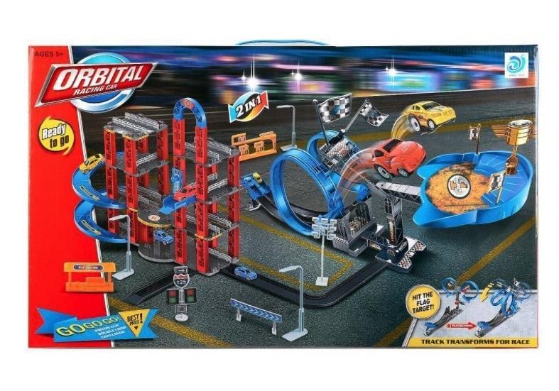 Tor z parkingiem to niekończąca się zabawa w wyścigi samochodowe. Od teraz dziecko wraz ze swoimi przyjaciółmi może stanąć do fascynującej rywalizacji. Podczas zabawy autka mogą ścigać się z bramki startowej osiągając prędkość dzięki specjalnej wyrzutni. Celem wyścigu jest wylądowanie na arenie i uderzeniu we flagę. Wygrywa ten, kto pierwszy zbije flagę i wyląduje na mecie. Trafienie autkiem we flagę pozwala transformować pionową pętlę. Montaż toru wyścigowego jest łatwy dzięki zatrzaskom i spinkom oraz nie potrzebujemy śrubek i dodatkowych narzędzi do uruchomienia toru. W zestawie znajdują się także akcesoria, które pozwalają poczuć sportowego ducha tj. chorągiewki, złoty puchar, stacja paliw, sygnalizacja, oświetlenie i znaki drogowe. Tor wyścigowy rozwija wyobraźnię dziecka oraz pozytywnie pływa na koordynację wzrokowo-ruchową.