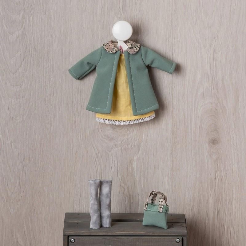Ręcznie szyty, oryginalnie zaprojektowany outfit w modnych odcieniach koloru zielonego i żółtego został zaprojektowany specjalnie dla lalek hiszpańskich z serii ASI Celia. Elegancki płaszczyk z kołnierzykiem wspaniale prezentuje się w zestawie z żółtą bawełnianą sukienką wykończoną białą koronką oraz getrami. Całość dopełnia stylowa torebka. Outfit na kartonowym wieszaczku z logo marki ASI zapakowany jest w foliowe opakowanie. Uzupełnij kolekcję ubranek lalek hiszpańskich i uatrakcyjnij dziecku zabawę! Wszystkie ubranka dla lalek marki ASI są w całości szyte w Hiszpanii.