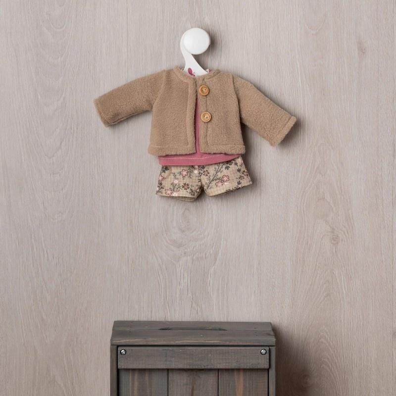 Stylowy komplet ubranek został zaprojektowany i ręcznie uszyty w Hiszpanii specjalnie dla lalek "przyjaciółek" z serii Sabrina. Różowa dzianinowa bluzeczka doskonale przentuje sie w komplecie z ciepłym płaszczykiem z ozdobnymi guziczkami z napisem: "handmade with love". W zestawie także krótkie spodenki w finezyjny wzór roślinny.