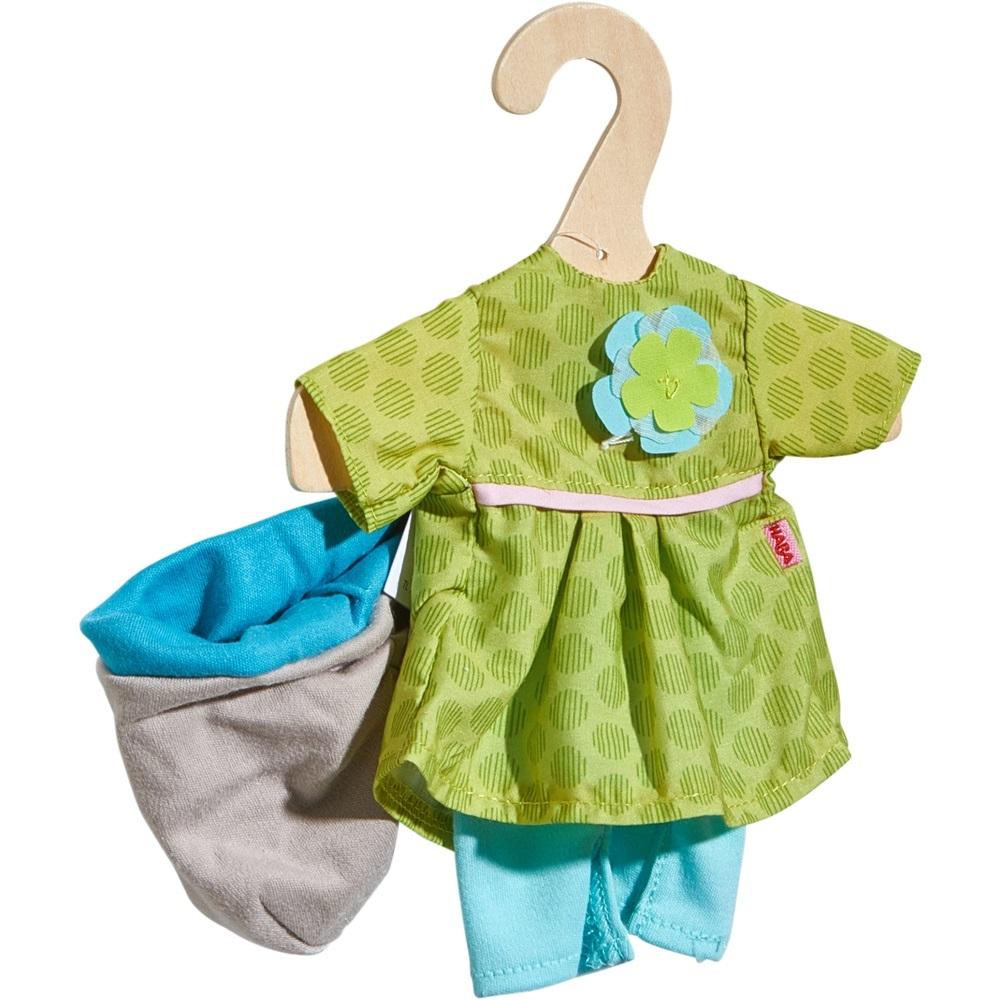 Zestaw ubranek Łąka marki HABA składa się  z niebieskich spodni i zielonej sukienki z ozdobnym kwiatem. Wystarczy jeszcze tylko szybko włożyć czapkę i lalka jest gotowa do wyjścia na spacer po łące lub na długą przechadzkę z przyjaciółkami.
