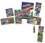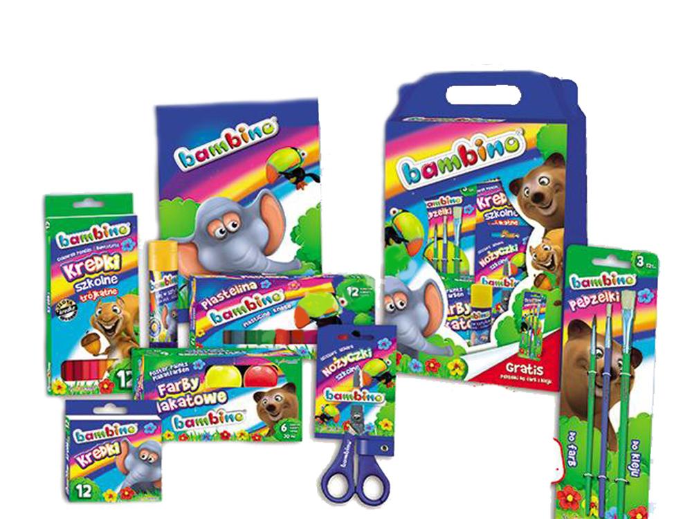 W zestawie: Kredki bambino 12 kolorów Kredki szkolne trójkątne 12 kolorów Plastelina 12 kolorów Farby plakatowe 6 kolorów Nożyczki szkolne z podziałką Zeszyt A5, 16 kartek w kratkę Klej w sztyfcie Pędzelki do farb i kleju