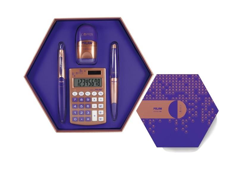 Zestaw upominkowy MILAN COPPER w kolorze fioletowym. Zawiera: kalkulator kieszonkowy POCKET COPPER, temperówko - gumkę CAPSULE COPPER, ołówek mechaniczny CAPSULE COPPER Slim, długopis CAPSULE COPPER. Wszystko zapakowane w ekskluzywne pudełko z nadrukiem nawiązującym do kloekcji COPPER