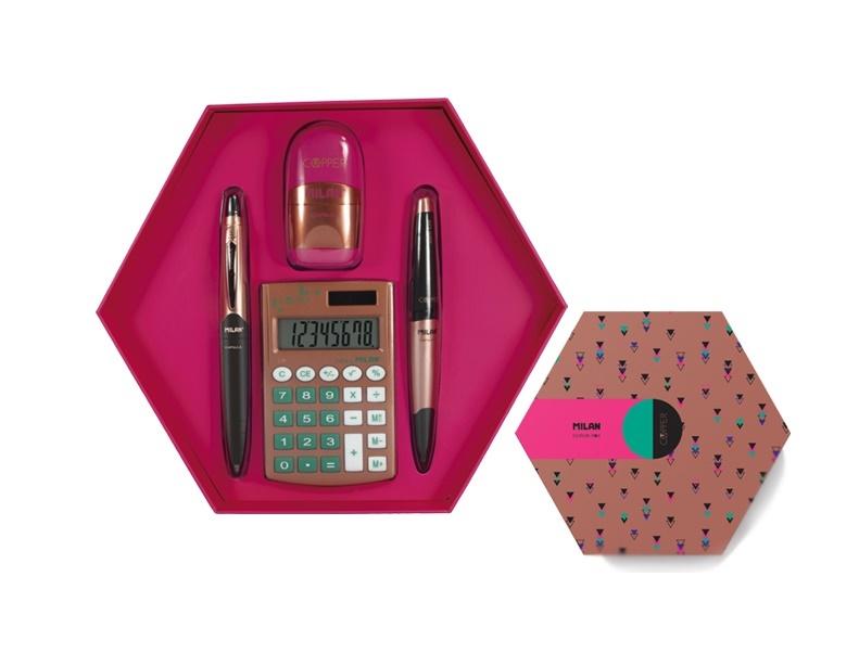 Zestaw upominkowy MILAN COPPER mix kolorów. Zawiera: kalkulator kieszonkowy POCKET COPPER, temperówko - gumkę CAPSULE COPPER, ołówek mechaniczny CAPSULE COPPER Slim, długopis CAPSULE COPPER. Wszystko zapakowane w ekskluzywne pudełko z nadrukiem nawiązującym do kloekcji COPPER