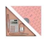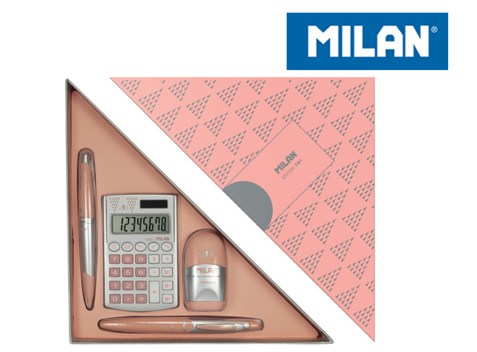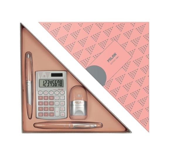 Zestaw upominkowy MILAN SILVER w kolorze różowym. Zawiera: kalkulator kieszonkowy POCKET SILVER, temperówko - gumkę CAPSULE SILVER, ołówek mechaniczny CAPSULE SILVER Slim, długopis CAPSULE SILVER. Wszystko zapakowane w ekskluzywne trójkątne pudełko z nadrukiem nawiązującym do kolekcji SILVER.