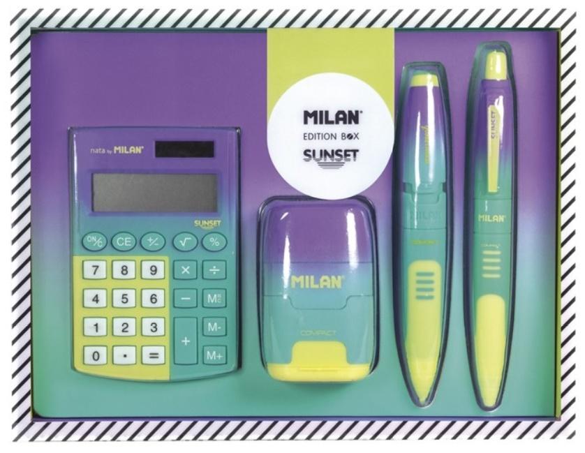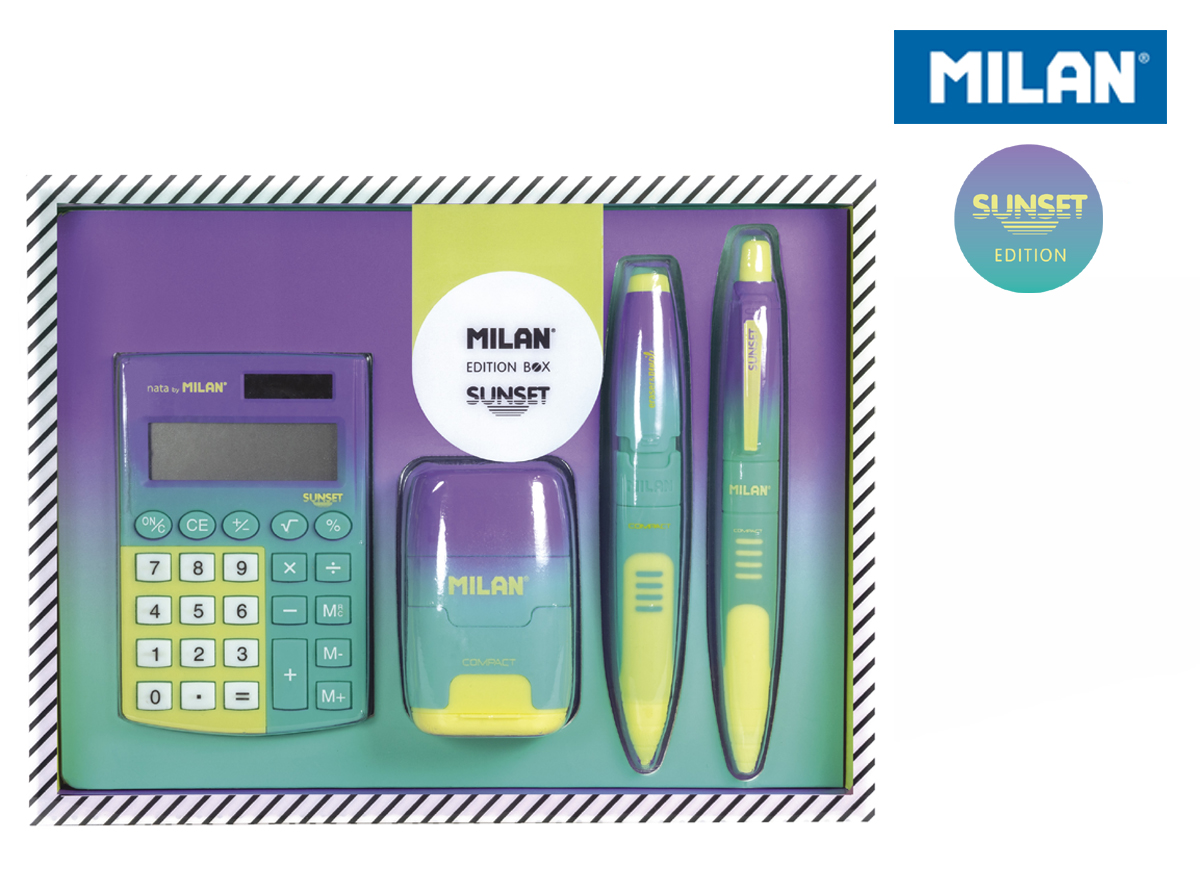 Zestaw upominkowy z produktami z kolekcji SUNSET w kolorach żółtym, liliowym i turkusowym. Prostokątne pudełko upominkowe z przezroczystym plastikowym przesuwanym wierzchem. Zawiera 4 prodykty: temperówko-gumkę COMPACT, długopis COMPACT z niebieskim tuszem, ołówek automatyczny COMPACT 0,7 mm 2B i 8-cyfrowy kalkulator kieszonkowy. Wymiary pudełka: 20,6 x 20,6 x 3,9 cm. Szczegółowy opis zawartości: 1. Temperówko-gumka COMPACT SUNSET to fantazyjne połączenie gumki i temperówki w jednym. Z jednej strony podwójna temperówka na cienkie i grube kredki i ołówki. Z drugiej miękka gumka syntetyczna, a po środku pojemnik na ścinki. Ma ostre i wytrzymałe ostrza ze stali węglowej dzięki czemu idealnie nadaje się do wszystkich rodzajów ołówków. Posiada system bezpiecznych ostrzy, który zapobiega odłączeniu się ostrza od korpusu temperówki. Idealne do użytku szkolnego. 2. Długopis COMPACT z niebieskim tuszem. Przybliżona długość pisania: 1000 metrów. Końcówka 1 mm. Atrament wyprodukowany w Niemczech. 3. Ołówek automatyczne z grafitem 2B 0,7 mm. Grafit 2B jest miękki dzięki czemu idealnie nadaje się do pisania i rysowania artystycznego. Na końcu pod obudową duża gumka do wymazywania. Ołówek o pogrubionym kształcie, ułatwiający uchwyt. 4. Kalkulator 8-pozycyjny z miękkimi gumowymi klawiszami. 3 klawisze pamięci. Klawisz zmiany znaku +/-. Pierwiastek kwadratowy. Podwójne zasilanie: bateria 1,5V oraz bateria słoneczna. Automatyczne wyłączanie. Kalkulatory MILAN spełniają wymagania dyrektywy RoHS o ograniczeniach stosowania niektórych substancji niebezpiecznych w urządzenia elektrycznych i elektronicznych. Rozmiar kalkulatora: 9,7 x 6,2 x 0,8 cm.
