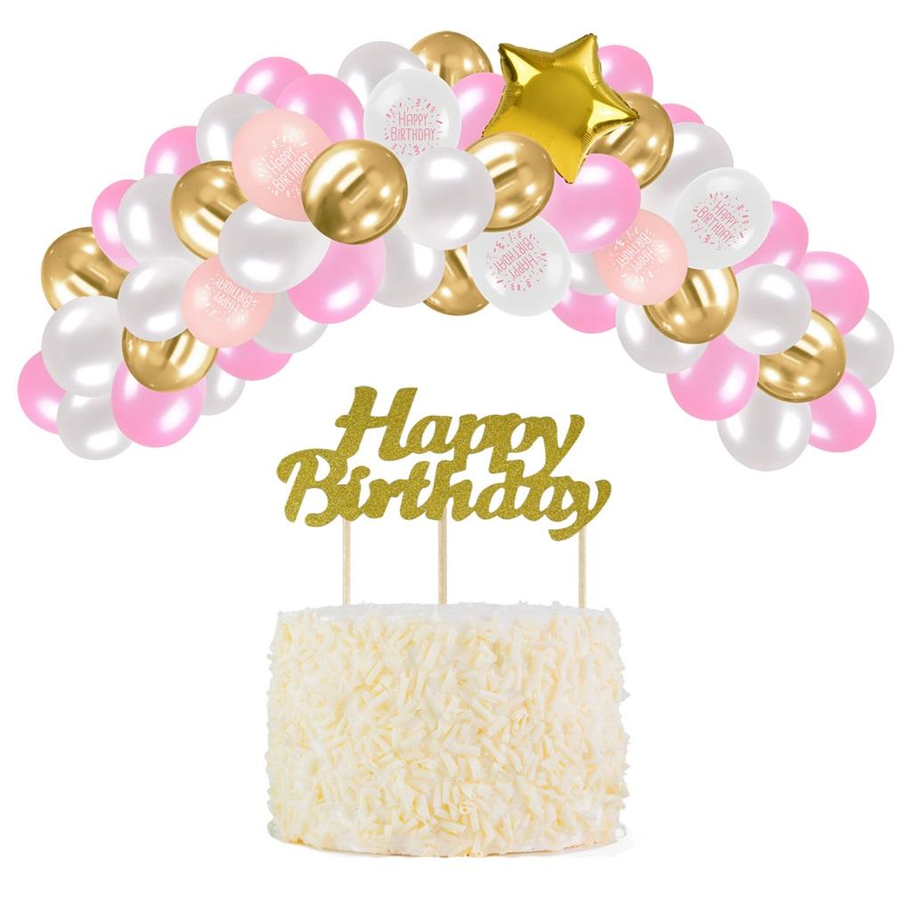 Zestaw dekoracji urodzinowych składający się aż z 53 elementów. To kompletna aranżacja imprezy urodzinowej dla dziewczynki lub fanów połączenia różu ze złotem. W zestawie: - 34 balony lateksowe w kolorach różowym (x17) i białym (x17), wielkości 25 cm - 6 balonów lateksowych z nadrukiem napisu Happy Birthday, w kolorach różowym (x3) i białym (x3) o wielkości 25 cm - 10 balonów lateksowych z efektem chromu w kolorze złotym. Wielkość balonów to 30 cm, - balon foliowy w kształcie gwiazdki w kolorze złotym. Wielkość: 45 cm, - topper na tort urodzinowy z napisem Happy Birthday podkreślający charakter okoliczności. Topper w kolorze złotym o wymiarach 13x14 cm, - taśma do girland balonowych długości 5 m