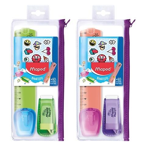 Zestaw Stick'Art w saszetce zapinanej na suwak. Zawiera 4 elementy: linijkę 15 cm, gumkę w plastikowej obudowie, temperówkę z pojemnikiem, jeden otwór, 5 listków naklejek. Produkty można dowolnie ozdobić dołączonymi naklejkami. Każdy produkt może wyglądać inaczej - zależy to wyłącznie od upodobań właściciela.