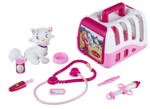 Klein 4821 Zestaw weterynarza z kotkiem Kolekcja Princess Coralie jest autorską kolekcją marki Klein. Skierowana do dziewczynek, oferuje szeroką gamę produktów doskonale uzupełniających się na wzajem. Podczas zabawy dzieci mogą naśladować zaobserwowane w świecie dorosłych sytuacje. Tak też jest w przypadku fantastycznego zestawu z chorym kotkiem. Wszystkie elementy umieszczone zostały w skrzynce będącej transporterkiem dla pupila. Zamykane przezroczyste drzwiczki pomogą wygodnie umieścić w nim chorego kotka lub wyjąć go do badania. Śliczny, biały, pluszowy kotek z fioletową obróżką bardzo potrzebuje pomocy, a więc zestaw zawiera wszystkie akcesoria niezbędne do tego aby się nim zaopiekować. Znajdują się tutaj: - stetoskop, - strzykawka, - termometr, - penseta, - karma dla kotów w puszce, - miseczka, - identyfikator lekarski Wymiary opakowania/skrzynki: 24 x 18,5 x 16,5 cm. Zabawka odpowiednia dla dzieci powyżej 3 lat